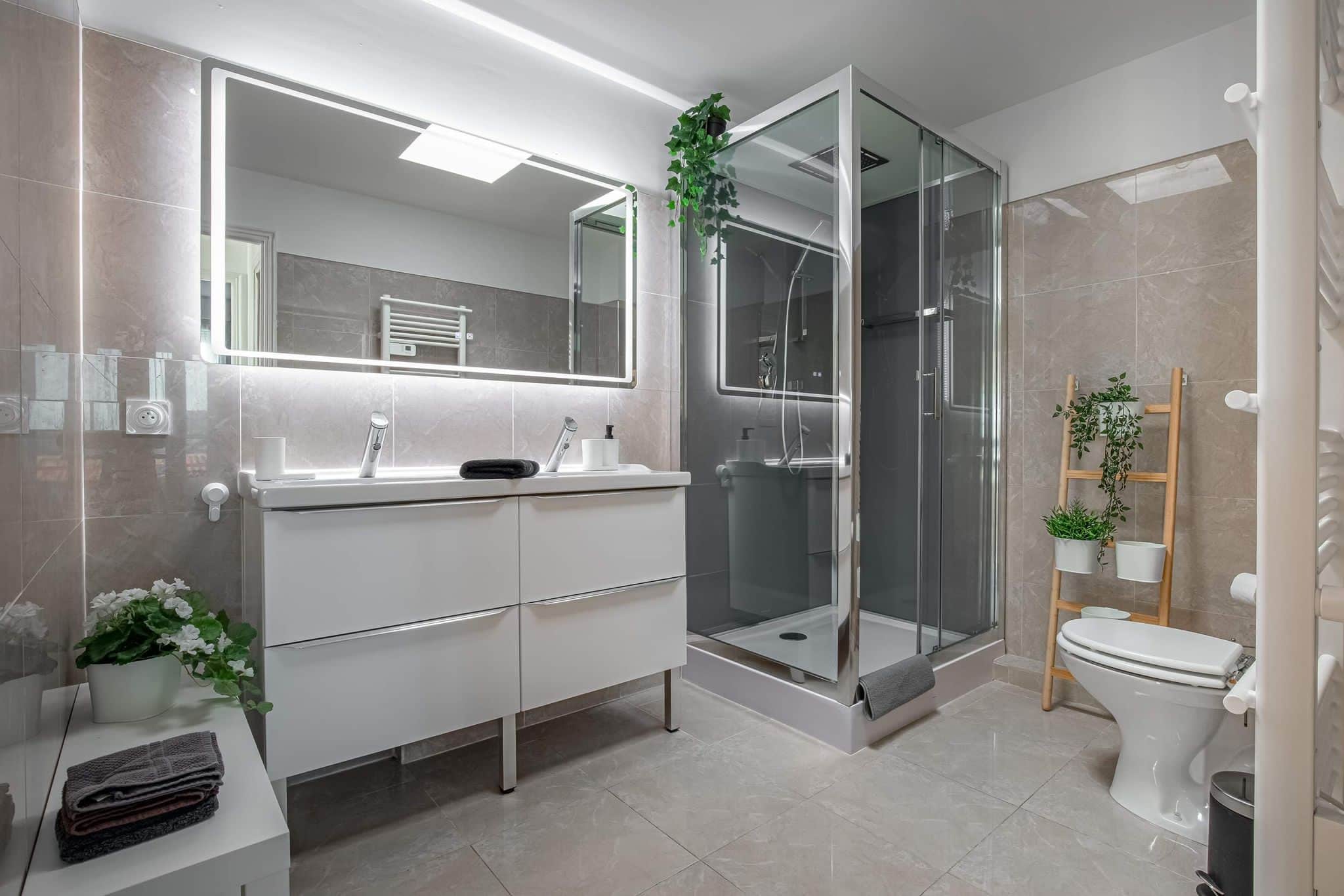 → Deux salles d’eau avec vasque et douche, mais aussi des WC indépendants + 1 suite parentale avec douche, baignoire et WC indépendants