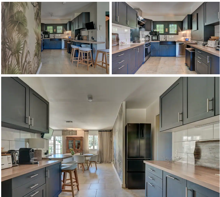 Des plaques de cuisson, un réfrigérateur américain, un congélateur, une machine à café Nespresso, une bouilloire, un micro-ondes, la vaisselle pour 8 personnes, un four et un lave-vaisselle.